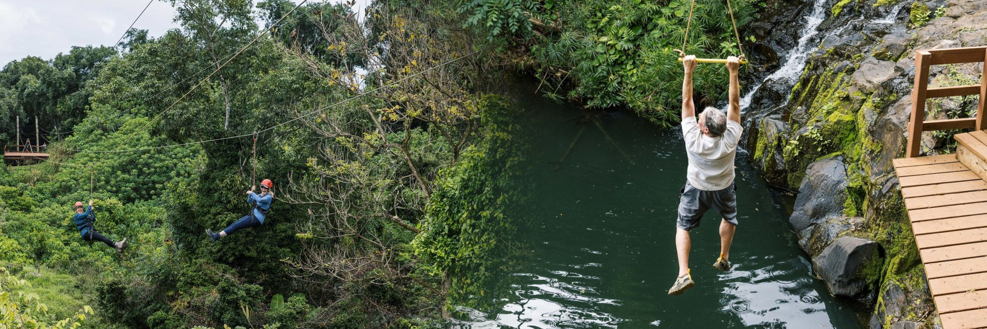Next, ride side-by-side with a friend on the thrilling 1,800-foot tandem zipline. With a unique center dismount, you'll enjoy over 90 seconds of adrenaline-pumping flight — more than a quarter-mile in the air! Finish your tour with a splash at the remote Blue Pool. Zip across the water on the exciting T-bar line, let go, and plunge into the refreshing natural pool. Afterward, relax aboard a Hawaiian-style motorized canoe for a scenic return trip along the river.